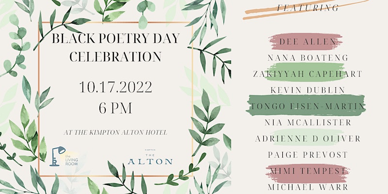 National Black Poetry Day + Add to Google Calendar + iCal export Date Oct 17 2022 Expired! Time 6:00 pm - 8:00 pm Share this event